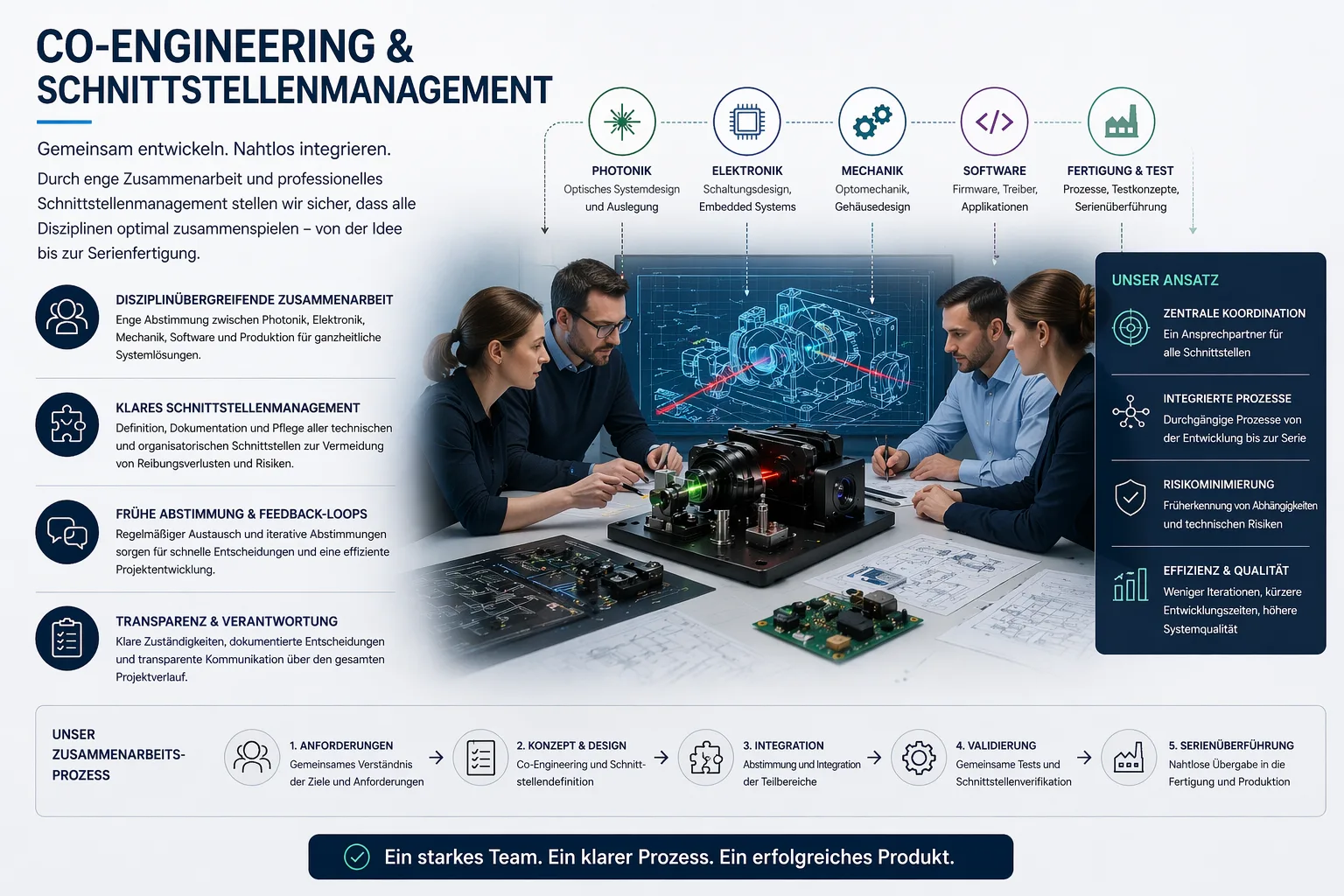 Durch die enge Verzahnung von Photonik-Engineering, Elektronikentwicklung, Einkauf und Produktion reduzieren wir Schnittstellenrisiken, verkürzen Entwicklungszeiten und schaffen die Grundlage für eine sichere und skalierbare Serienüberführung.