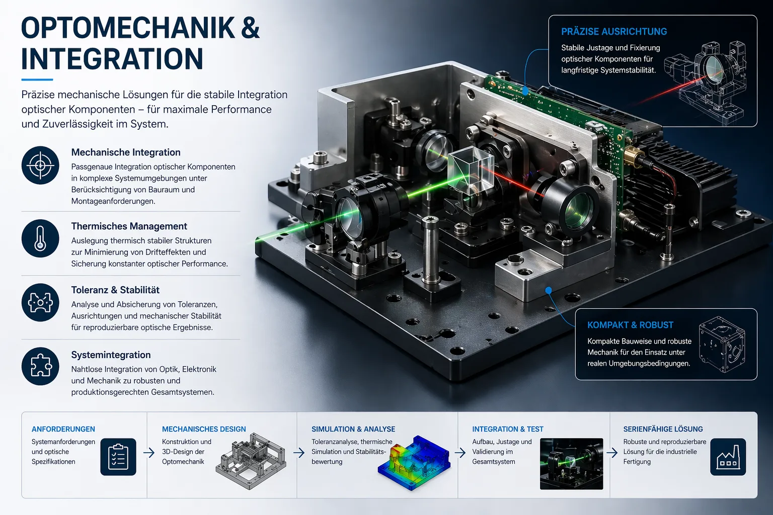 Dabei adressieren wir komplexe Anforderungen in Bereichen wie Laser- und Sensorsysteme, Imaging-Lösungen sowie die Integration optischer Komponenten in elektronische Gesamtsysteme. Aspekte wie Toleranzketten, thermische Stabilität, Justageprozesse und Kalibrierbarkeit werden bereits in der frühen Entwicklungsphase konsequent berücksichtigt.