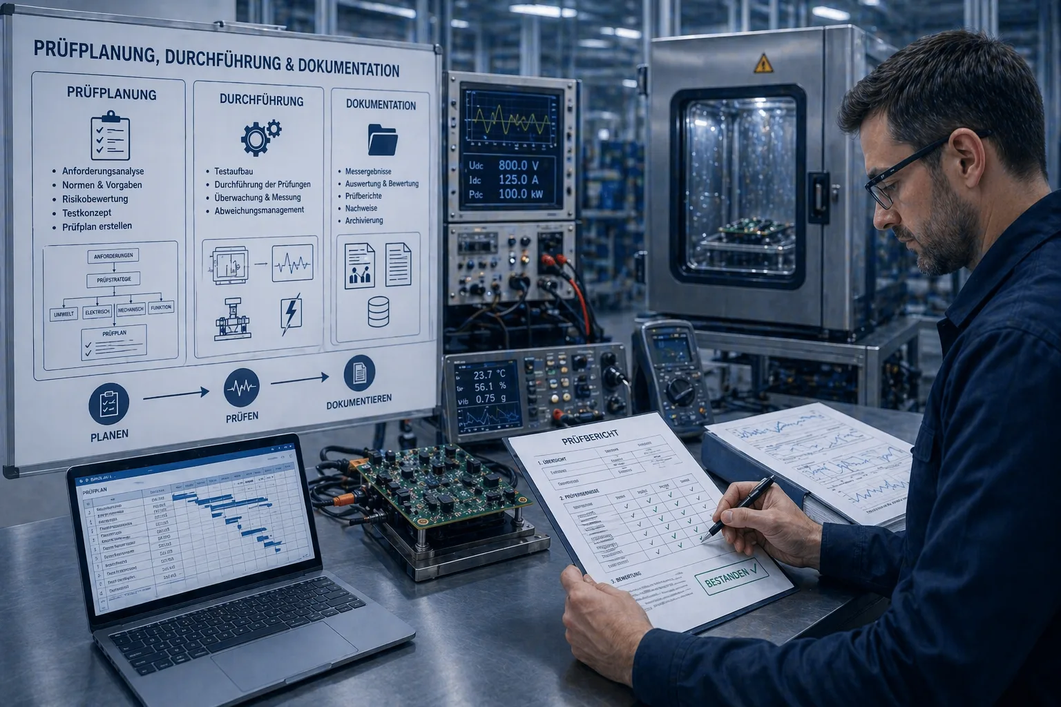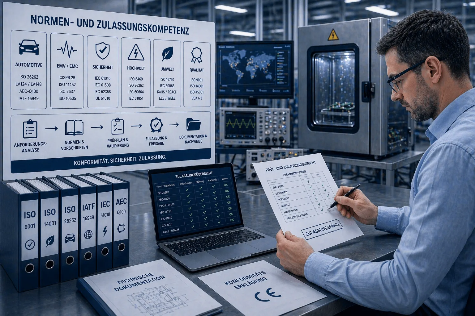 Wir begleiten unsere Kunden durch den gesamten Prozess – von der ersten Anforderungsanalyse über die Prüfplanung bis hin zur normgerechten Freigabe und Serienüberführung.