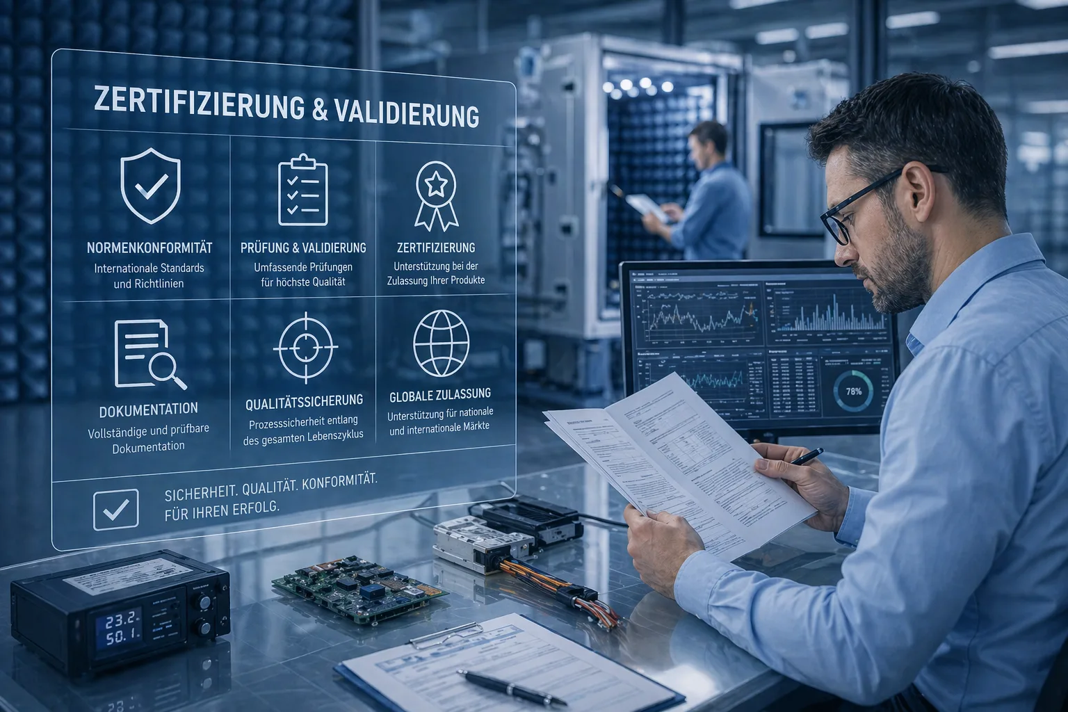 Dabei integrieren wir Testing und Zertifizierung bereits früh im Entwicklungsprozess, um Risiken zu minimieren, Iterationen zu reduzieren und eine sichere, reproduzierbare Serienqualität zu gewährleisten.