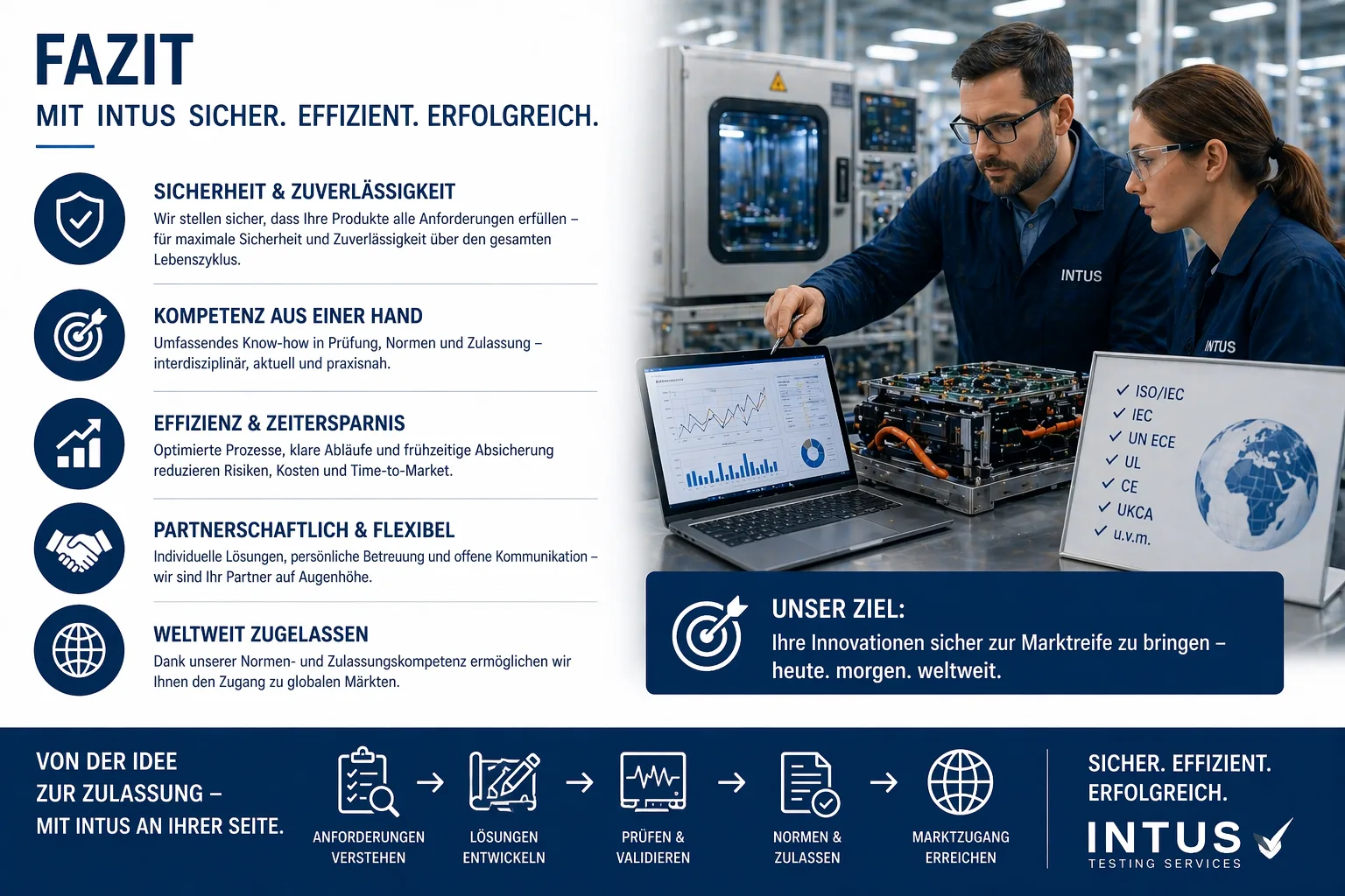 Der Leistungskatalog von INTUS im Bereich Prüfung, Validierung und Zertifizierung umfasst alle Schritte von der Anforderungsanalyse über die Prüfplanung und -durchführung bis hin zur normgerechten Dokumentation und erfolgreichen Marktzulassung.